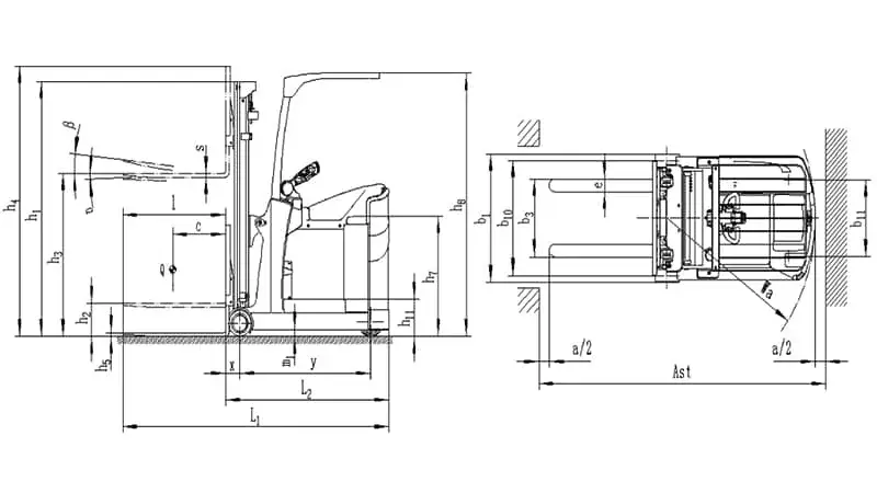 | Right angle stacking aisle width, pallet 1000×1000, Ast (mm) | 2273+200 | 2638+200 | |