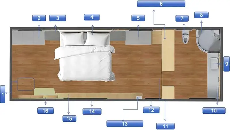 | Water & Sanitary System | Camp water inlet (under chassis) PPR fresh water pipes (20 mm), PVC grey water pipes (50 mm), black water pipe (110 mm) | |
